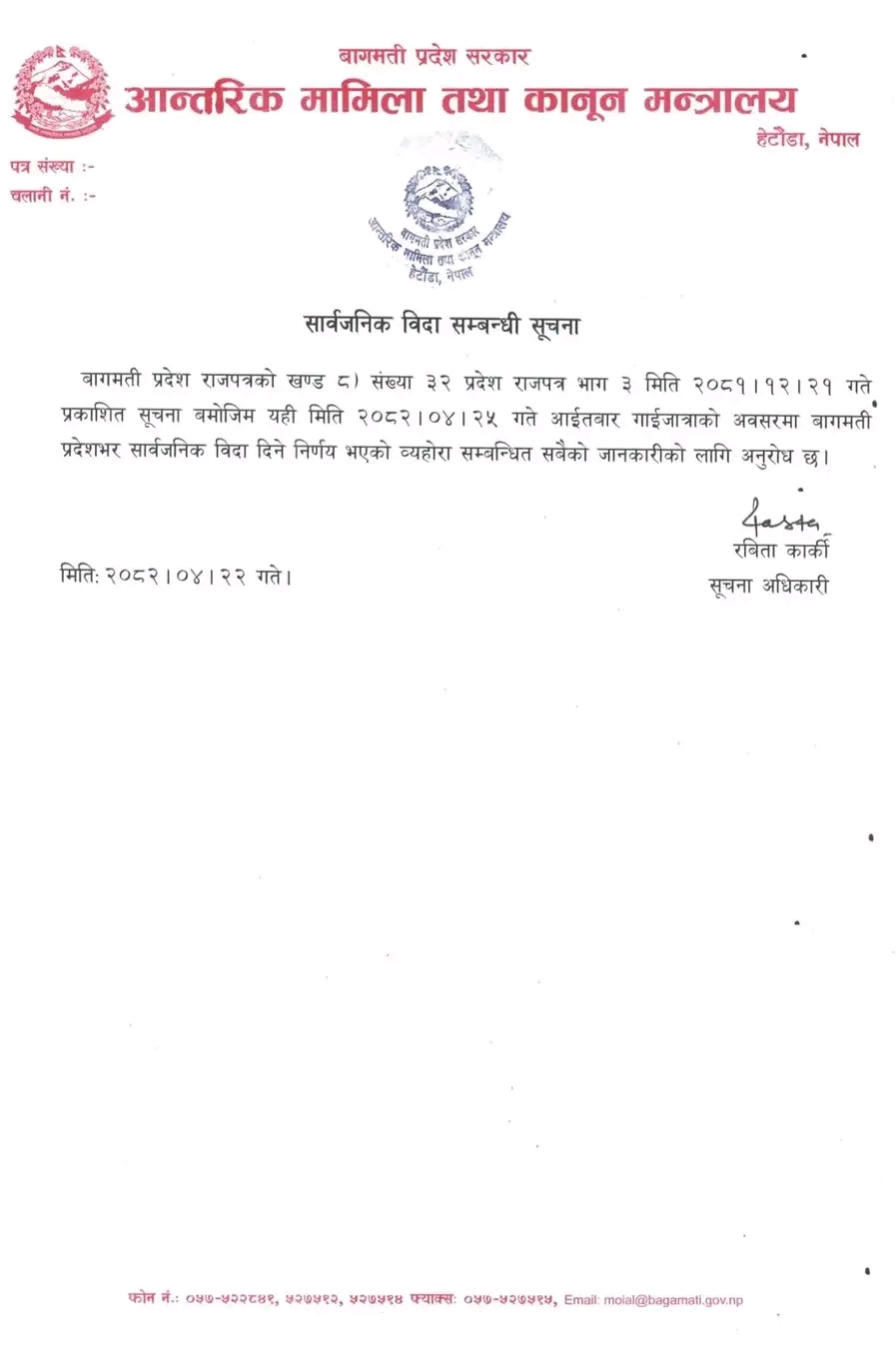 बागमती प्रदेश सरकारले साउन २५ गते (आइतबार) गाईजात्राको अवसरमा सार्वजनिक बिदा दिने निर्णय गरेको छ। आन्तरिक मामिला तथा कानुन मन्त्रालयद्वारा बिहीबार प्रकाशित सूचनामा सो जानकारी दिइएको हो।