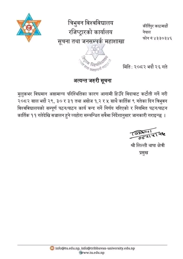 देशभर विद्यमान असामान्य परिस्थितिका कारण आउँदाे हिउँदे बिदाबाट कटौती गर्ने गरी विश्वविद्यालयको सम्पूर्ण पठनपाठन कार्य बन्द गर्ने निर्णय गरेकाे सूचनामा उल्लेख छ ।